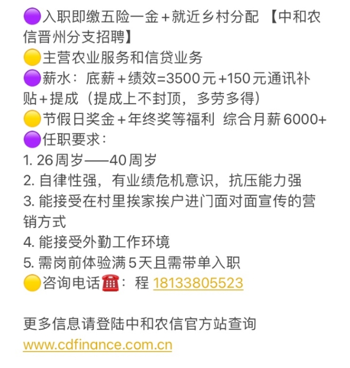 🟣入职即缴五险一金+就近乡村分配 【中和农信晋州分支招聘】